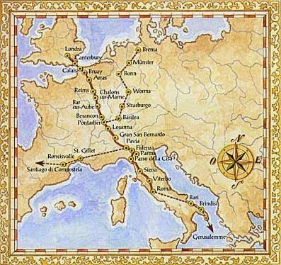 | La Via Francigena collega Canterbury con Roma, e poi continua fino a Gerusalemme. |